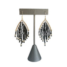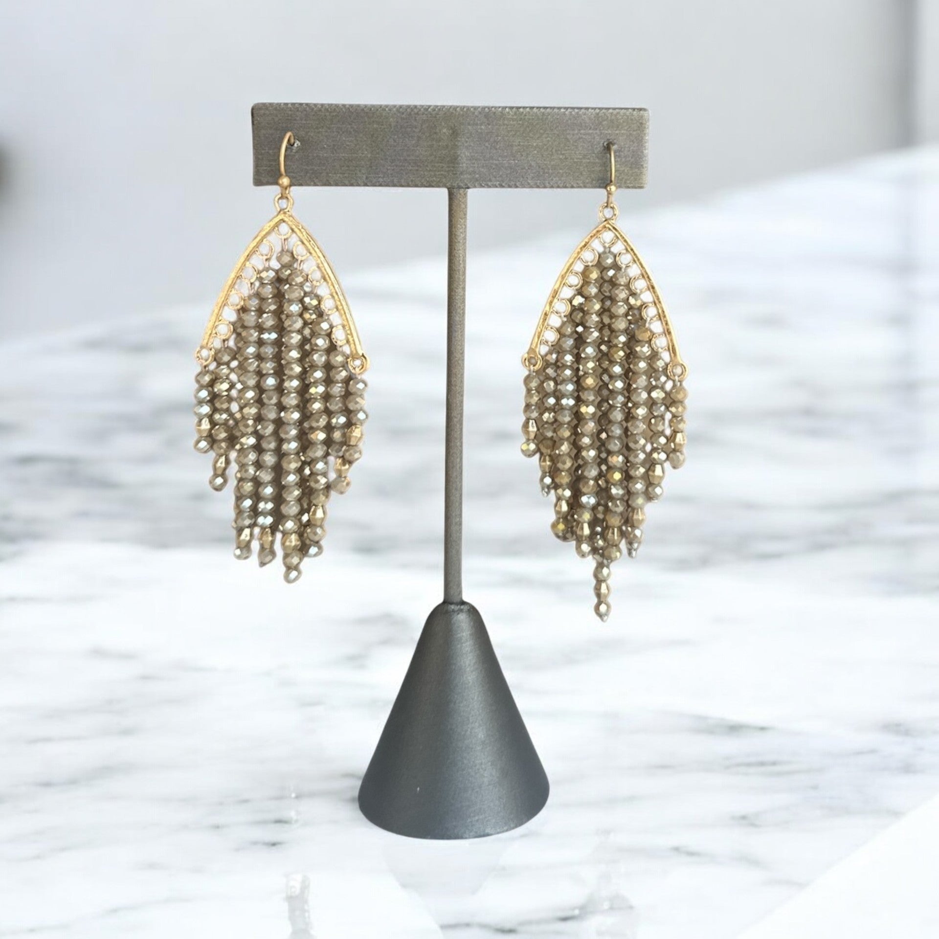 Austrian crystal hand-beaded earrings in a choice of colors. This chandelier style earring features a tiered, cascading design with hanging strands of crystal beads with brushed gold accent beads.