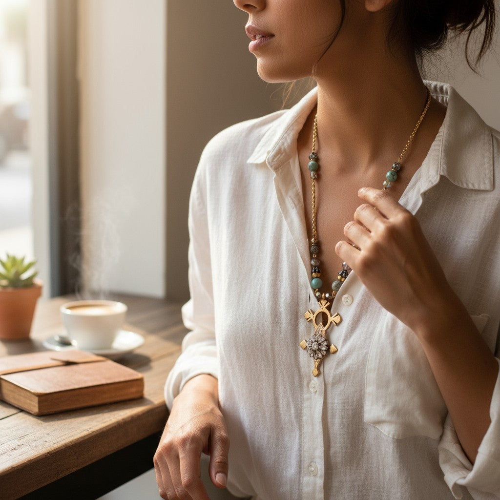 Embrace the bold spirit of the African desert with our Tuareg cross pendant necklace collection, where each brass cross, unique to the Tuareg tribes, tells a story of heritage and sacred tradition. Antique brooch components and carefully chosen gemstone beads add layers of meaning and beauty to every piece. These necklaces are treasures born from the heart of the Sahara, each one handcrafted to reflect the strength and mystique of ancient nomadic cultures. Wear a symbol of the untamed allure of tribal artistry and awaken the nomad within.