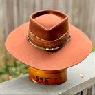 - Warm brown 100% beaver fur felt with silk hat band and beaded leather trim