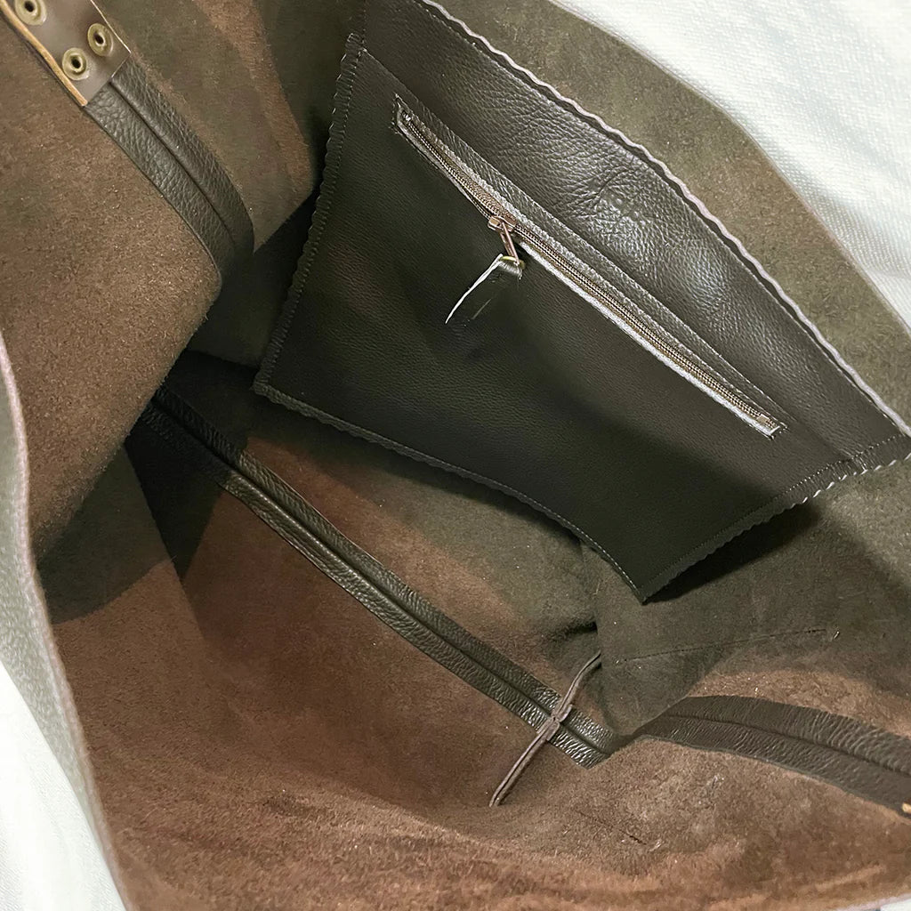 • Roomy interior zip pocket (9"W x 7"D) with leather pull