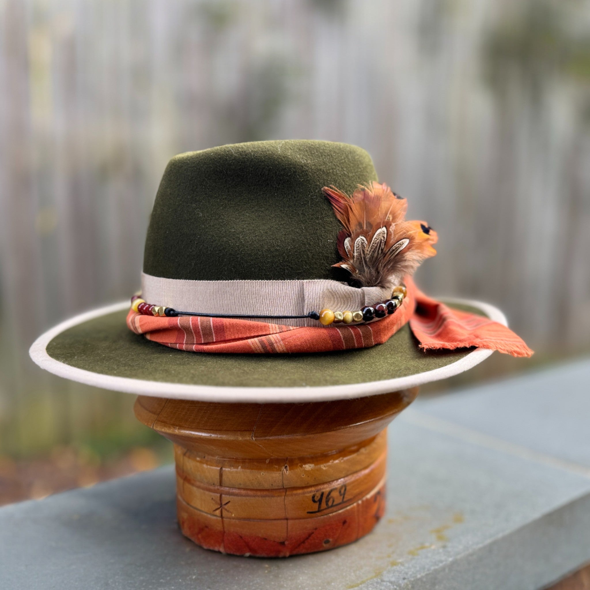 Terracrest Fedora by Sigil Hats channels the warmth and strength of the earth itself. This olive green fedora features vivid orange accents and feathers that catch the light like embers against moss. Rooted in natural tones yet refined in form, it embodies balance — grounded but bold, effortless but intentional. Designed in Asheville, NC, Terracrest is a symbol of quiet fire and steadfast style.