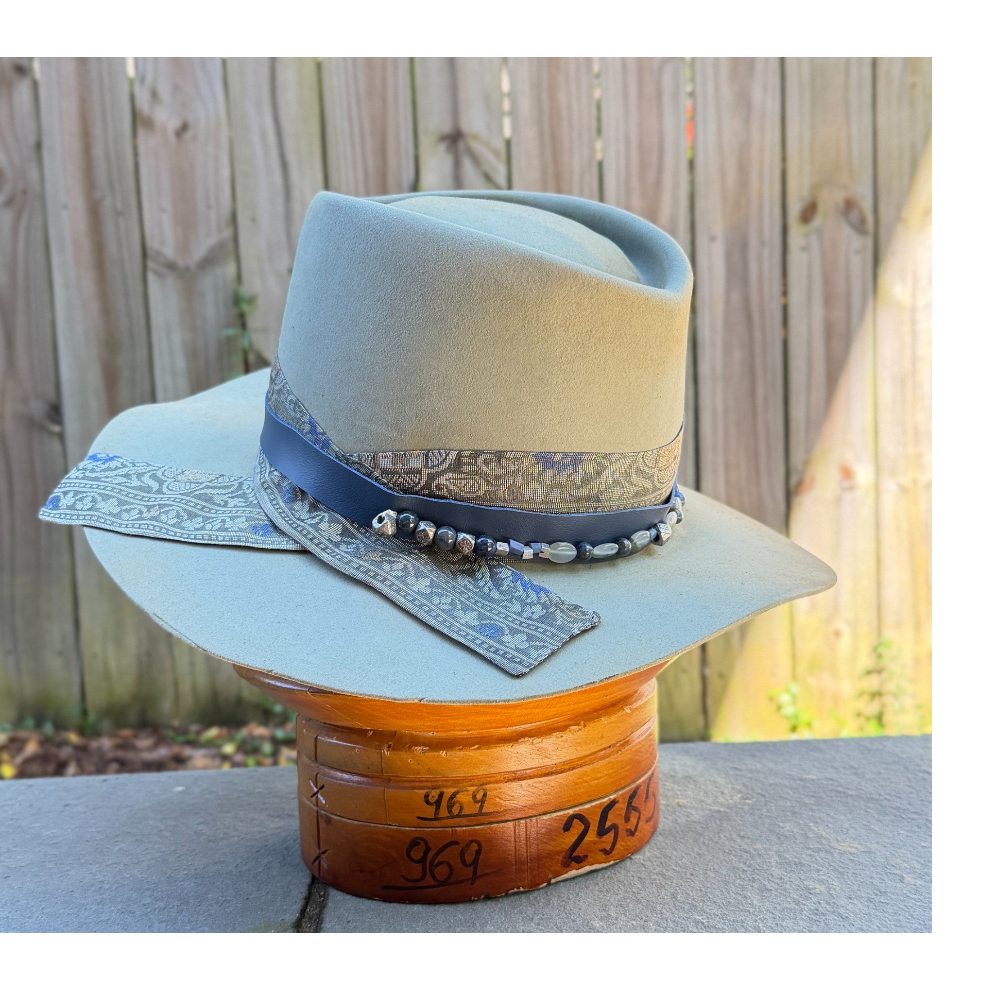 Driftflower Fedora by Sigil Hats drifts between elegance and ease, carrying the calm of blue skies and the softness of bloom. This light blue teardrop crown fedora features a smooth blue leather band and a delicate floral ribbon that adds a touch of natural charm. Handmade in Asheville by Sigil Hats, it’s a portrait of quiet beauty — refined, gentle, and endlessly wearable.