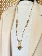 Gorgeous African brass Tuareg cross with aqua jewel and finished with dragon skin jasper and Austrian crystal.