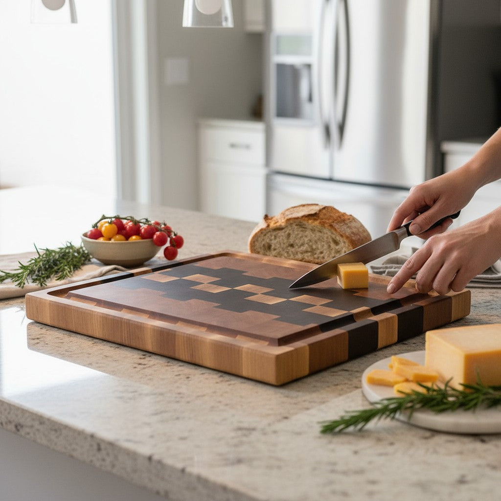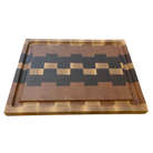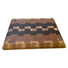 A masterwork of craftsmanship, this chaos end grain cutting board features a bold mosaic of walnut, cherry, and maple. Built for performance and beauty, its durable construction is gentle on knives while the integrated juice groove and brass-capped feet add both function and flair. A standout piece for serious cooks and design lovers alike.
