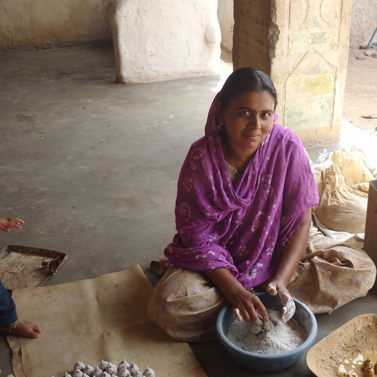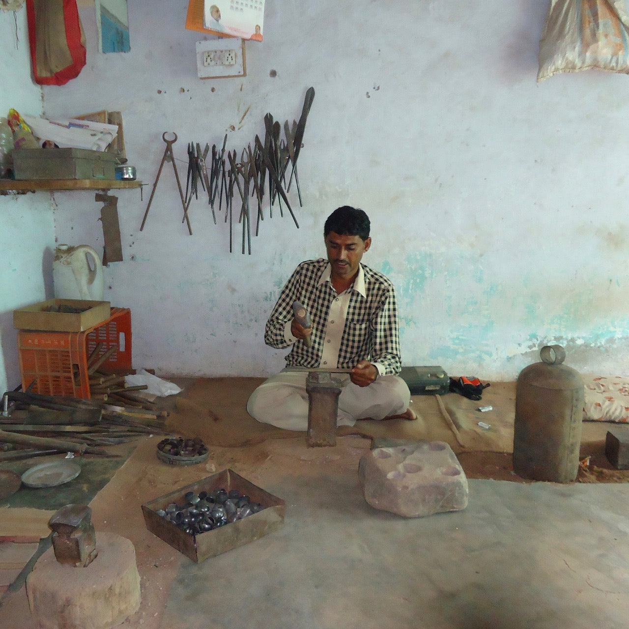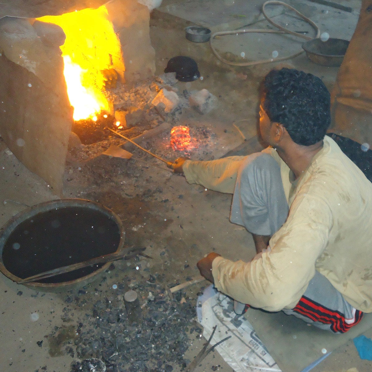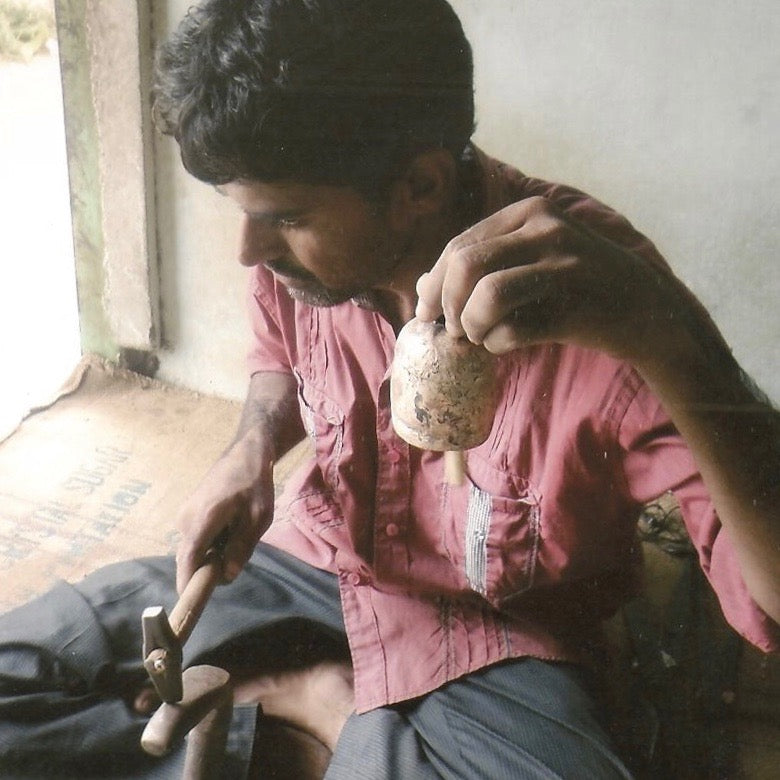 Recycled steel is used to form the bells. Each bell is first beaten into shape by hand, dipped in copper, padded with clay, then buried under the hot desert sand in a kiln. This firing anneals the metals into bronze. After firing, the clay is chiseled off. Finally, Janmamad personally hand-tunes each bell in every chime!