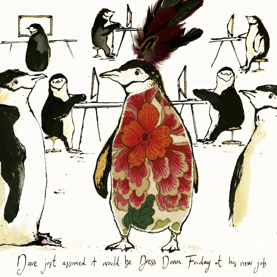 A greetings card illustrated with Dave the penguin casually dressed at work and the handwritten text ‘Dave just assumed it would be Dress Down Friday at his new job‘.