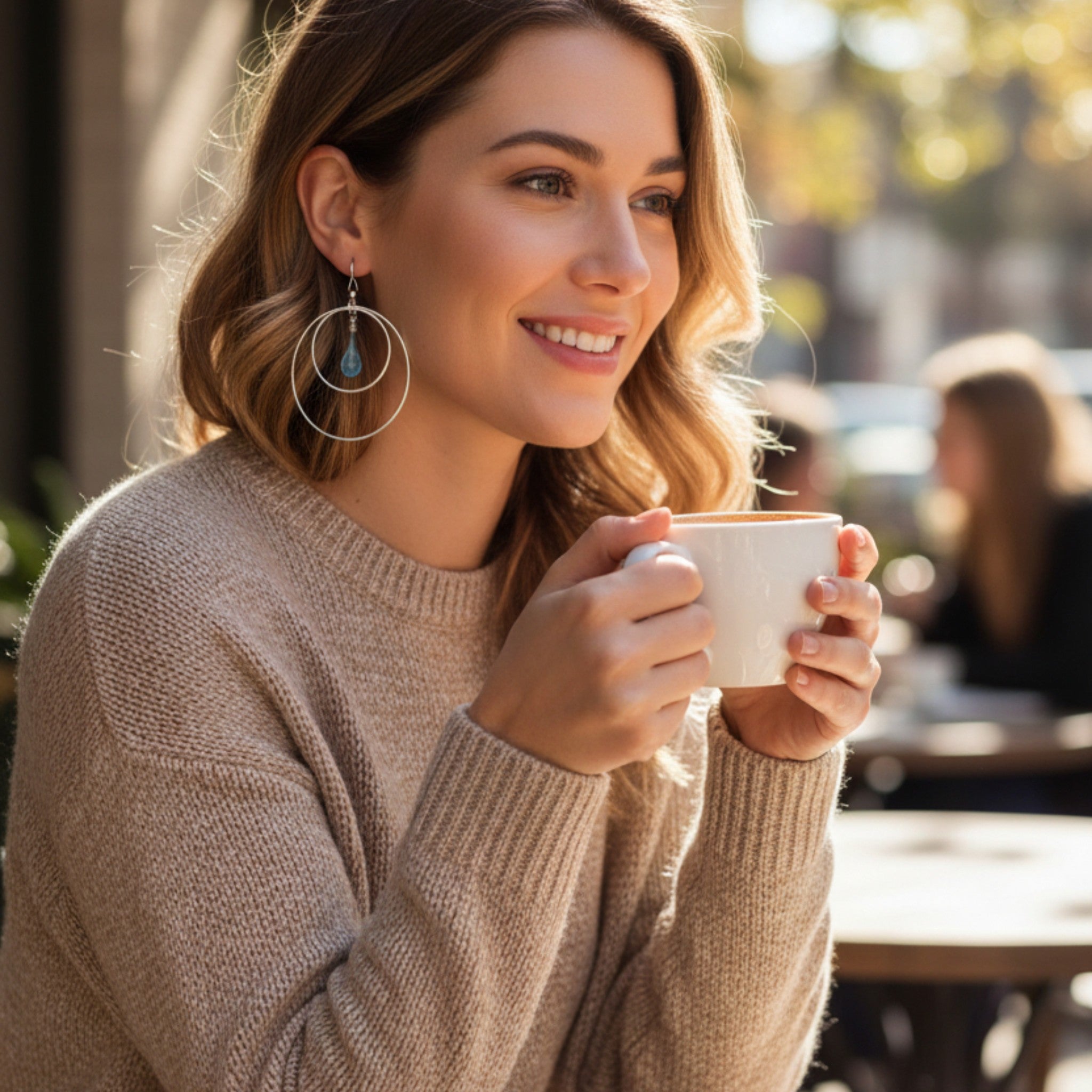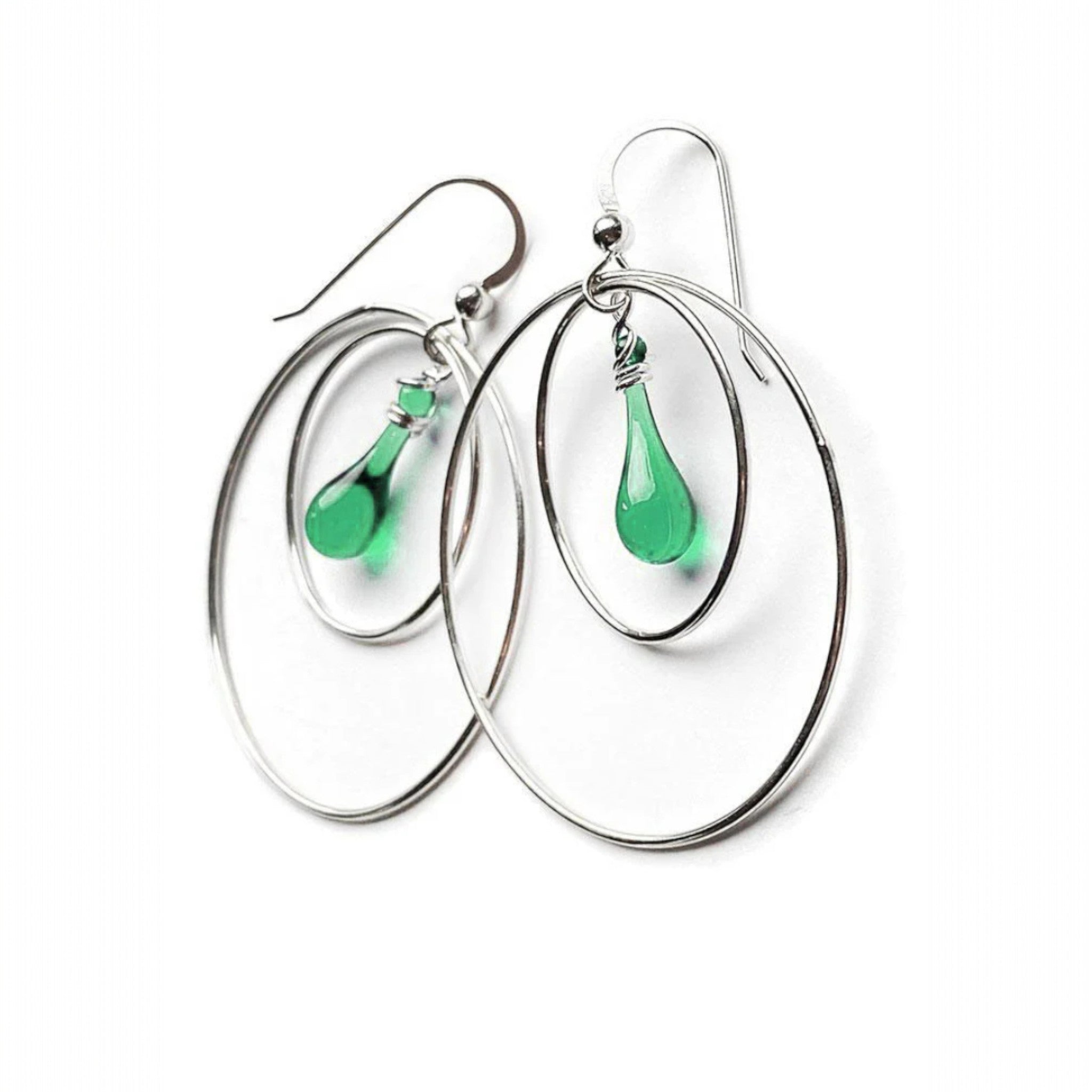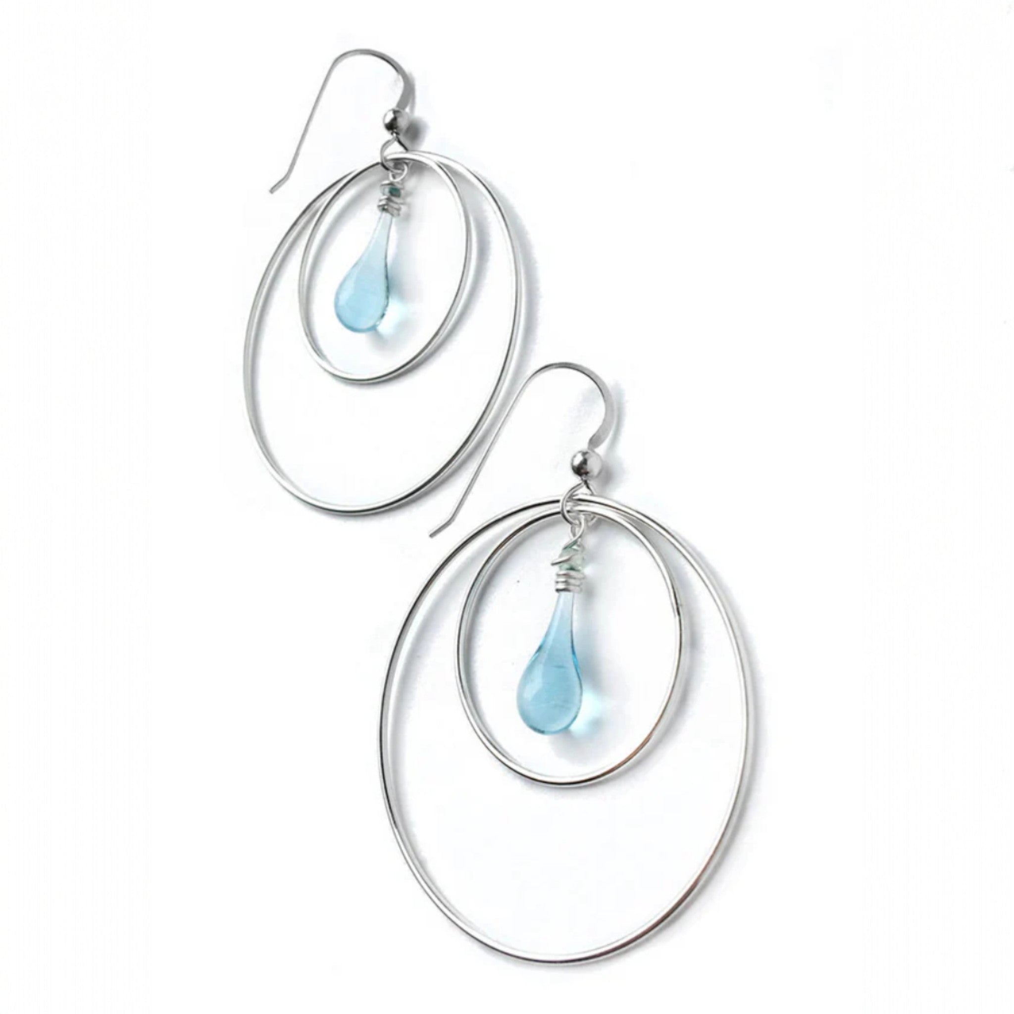 These double hoop earrings with a dainty drop of glowing glass will carry you through any day - or night! Slightly larger than the Small Eclipse, these are sized just right to make a bit of a statement. The tiny pop of color is framed in circles of sparkling silver, with each element swinging freely - a glittering motion that is sure to catch the eye.