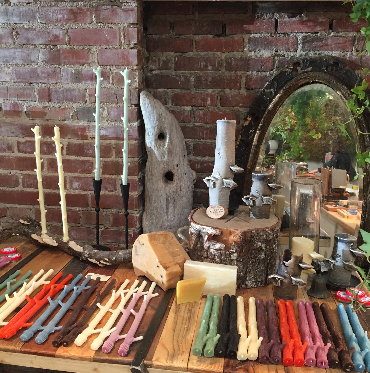 Handmade 100% beeswax candles cast from sticks, leaves, and branches.