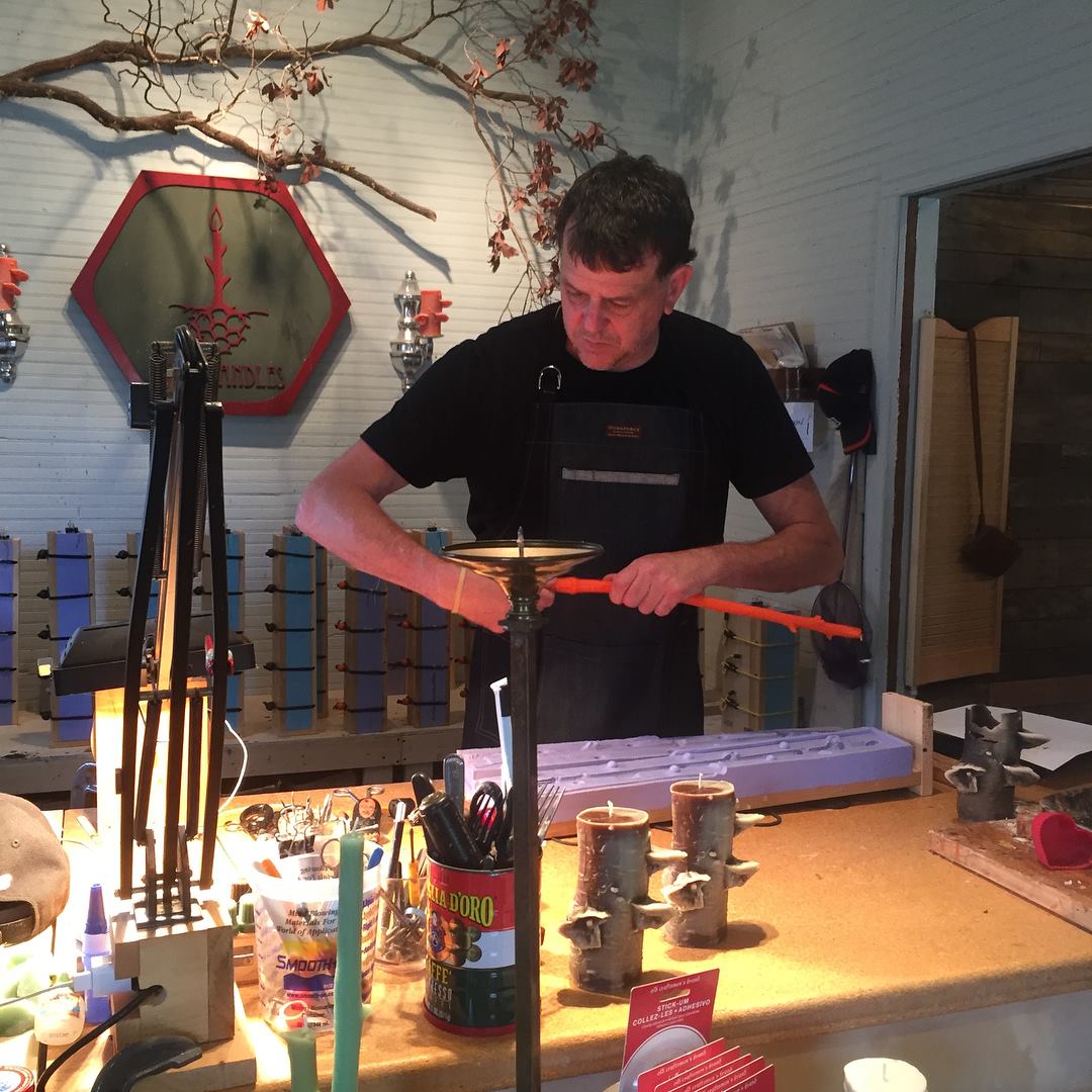 Handmade 100% beeswax candles cast from sticks, leaves, and branches.
