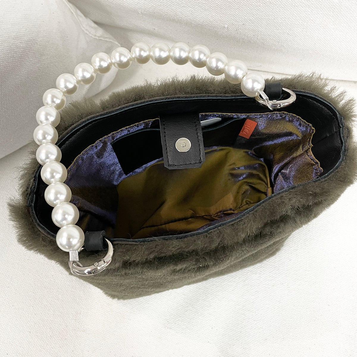 - Iridescent lined interior with top leather band
