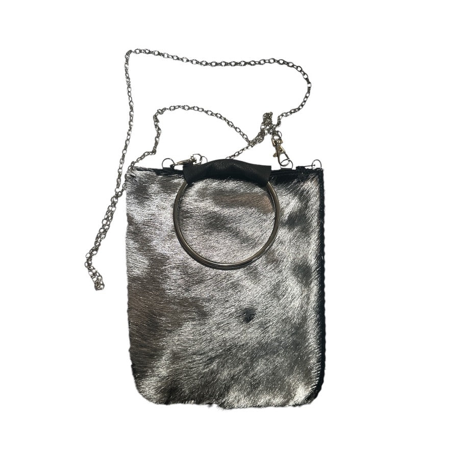 Silver Fur and Genuine Leather handbag with metal handle AND crossbody strap. Carry on your arm using the metal handle or crossbody with the chain strap for hands free. Convenient back cell pocket and interior pocket. Unique and versatile style makes a statement with any outfit. Holds your cell, money, credit cards, glasses, lipstick, keys.