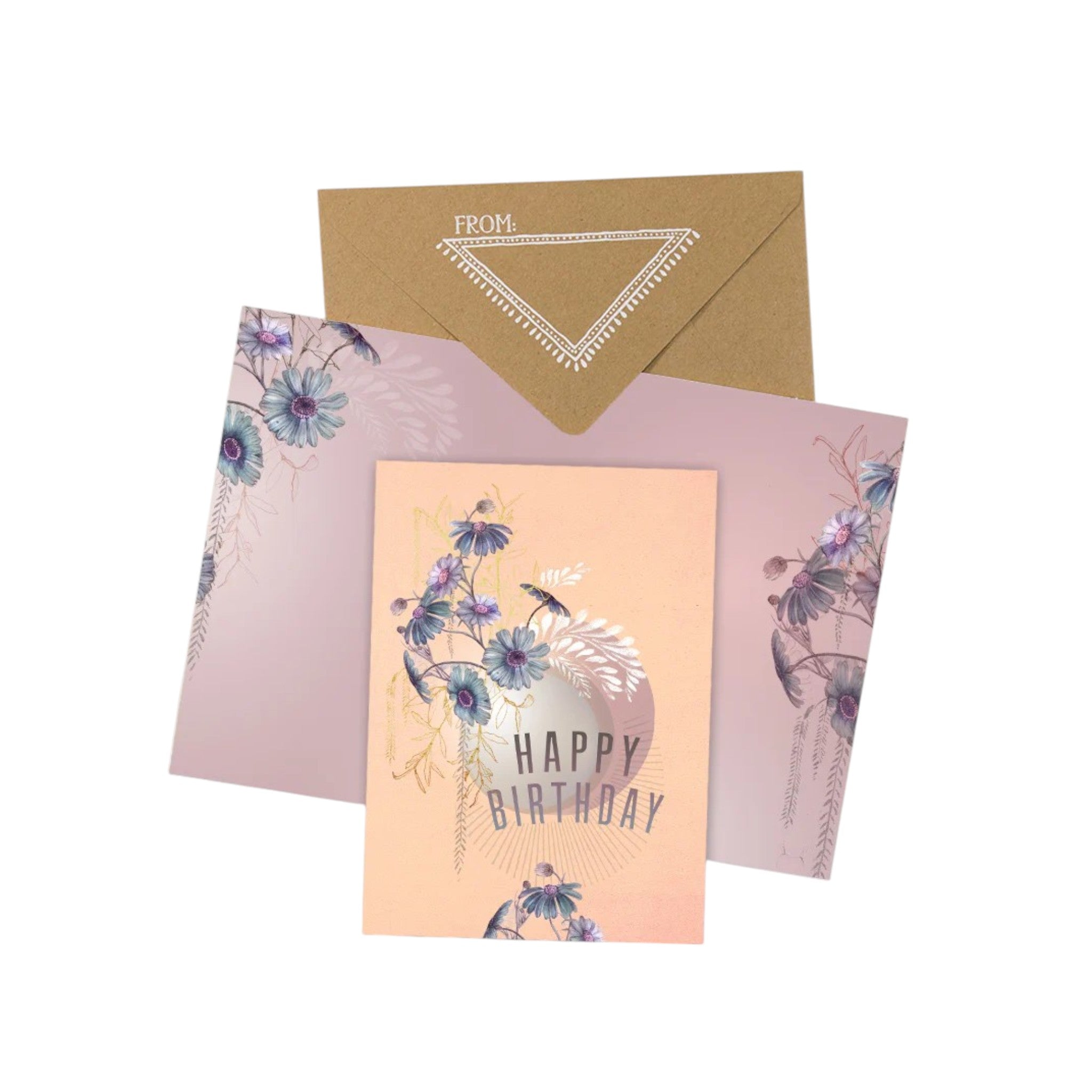 PAPAYA’s classic Blue Cosmos Greeting Card is a fan favorite illustrated with original artwork of vibrant blue wildflowers, delicate leaves, sun rays and special gold foil finishing details; it is sure to brighten your day. Perfect for birthdays that celebrate the feminine spirit and special occasions that need a touch of beauty and creative abandon.