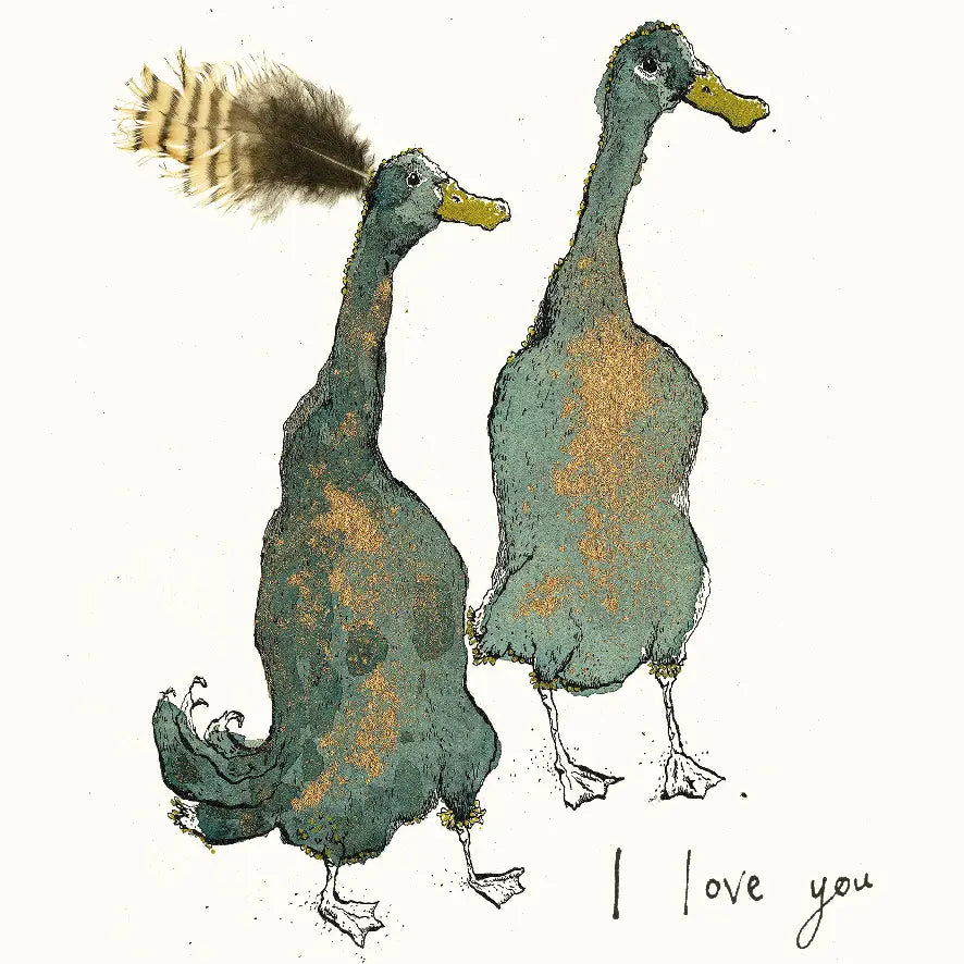 A greetings card illustrated with two green duck and the handwritten text ‘I love you’. Left blank inside so that you can write your own message. 6" x 6". Printed on a heavy-weight, soft mat finish, FSC certified card and supplied with a high quality envelope. Designed and printed in the UK.
