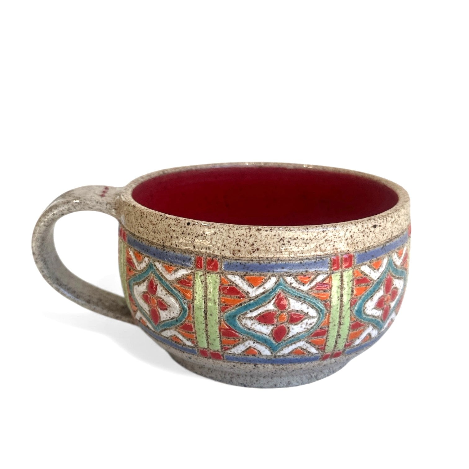 Like tiles on a door in Morocco, this carved stoneware latte mug says welcome. Welcome to a warm and welcoming taste experience. You deserve it. You know deep down you do.