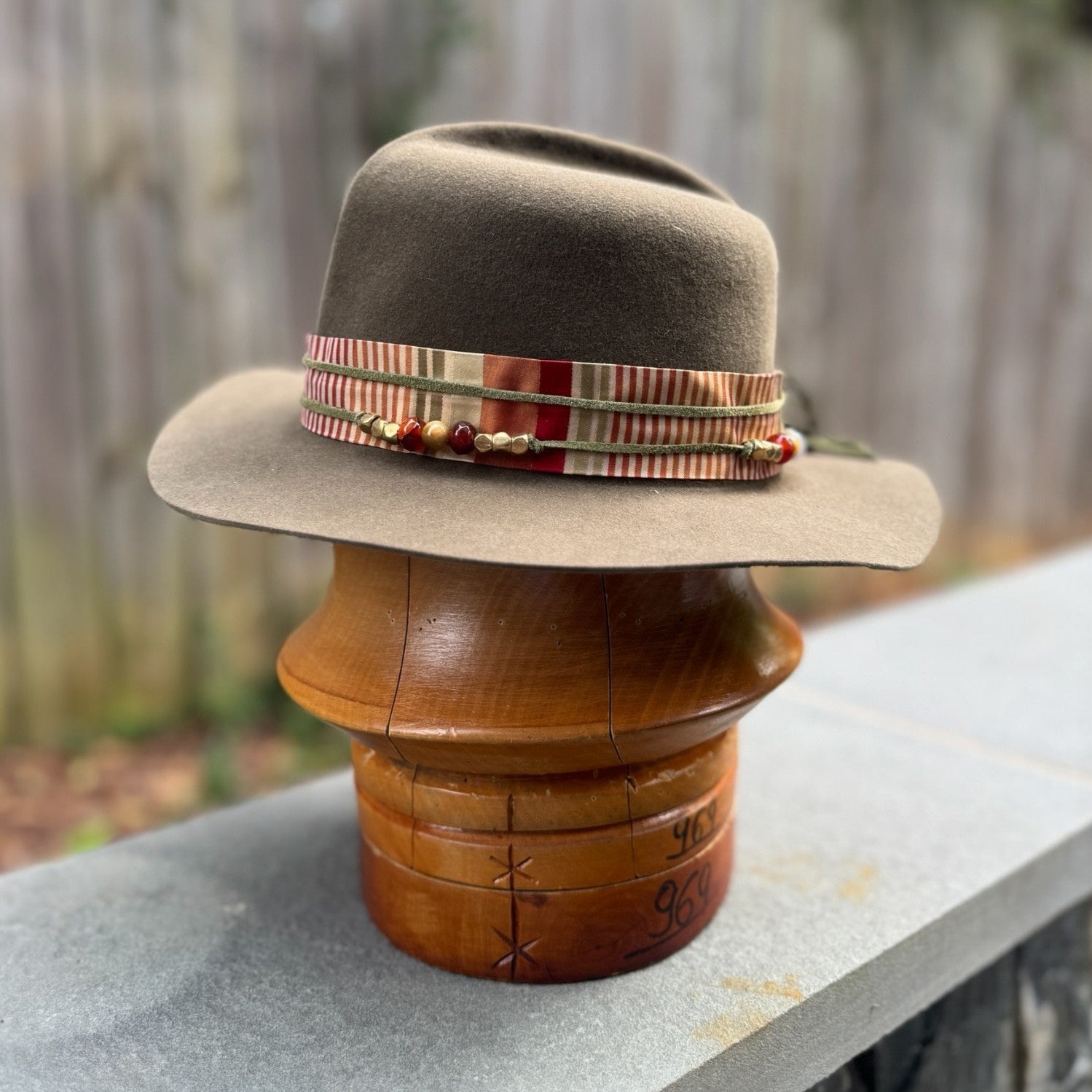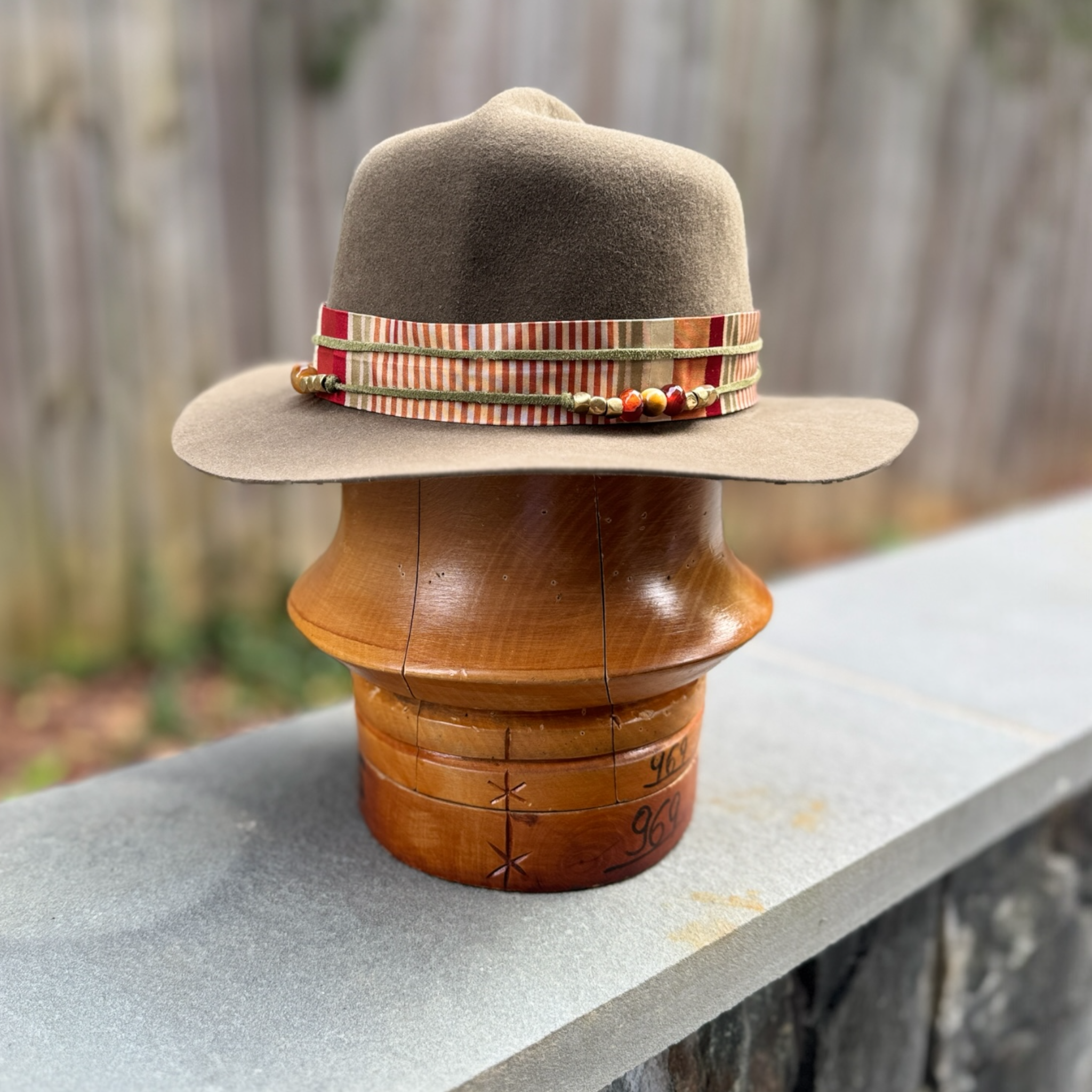 Autumn Ridge Fedora by Sigil Hats captures the warmth and richness of fall. This gray-brown fedora is accented with a red and orange striped ribbon and matching beads, evoking the glow of autumn leaves against a muted landscape. Handmade in Asheville, NC, Autumn Ridge combines bold yet balanced colors with elegant details for a statement of refined, effortless style.