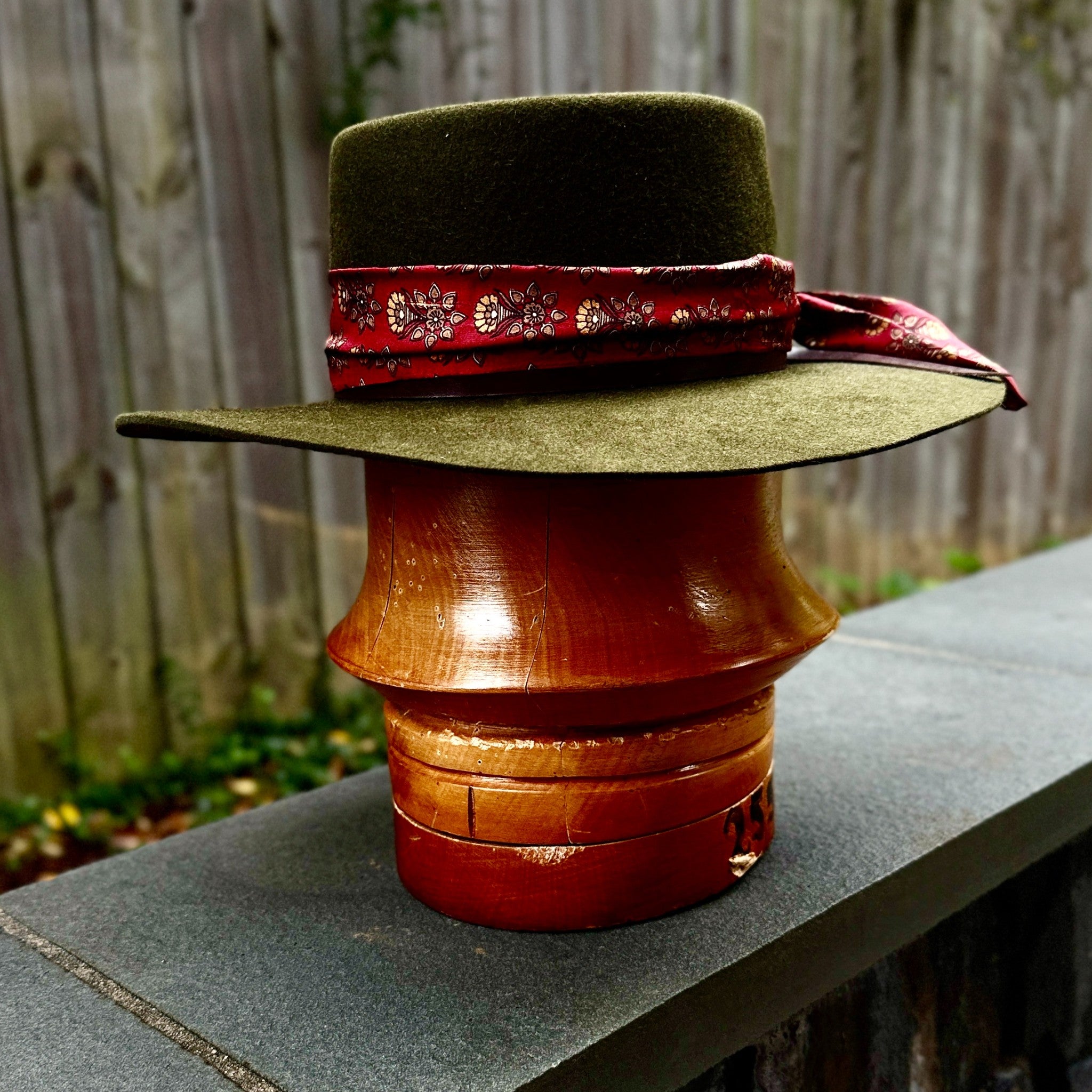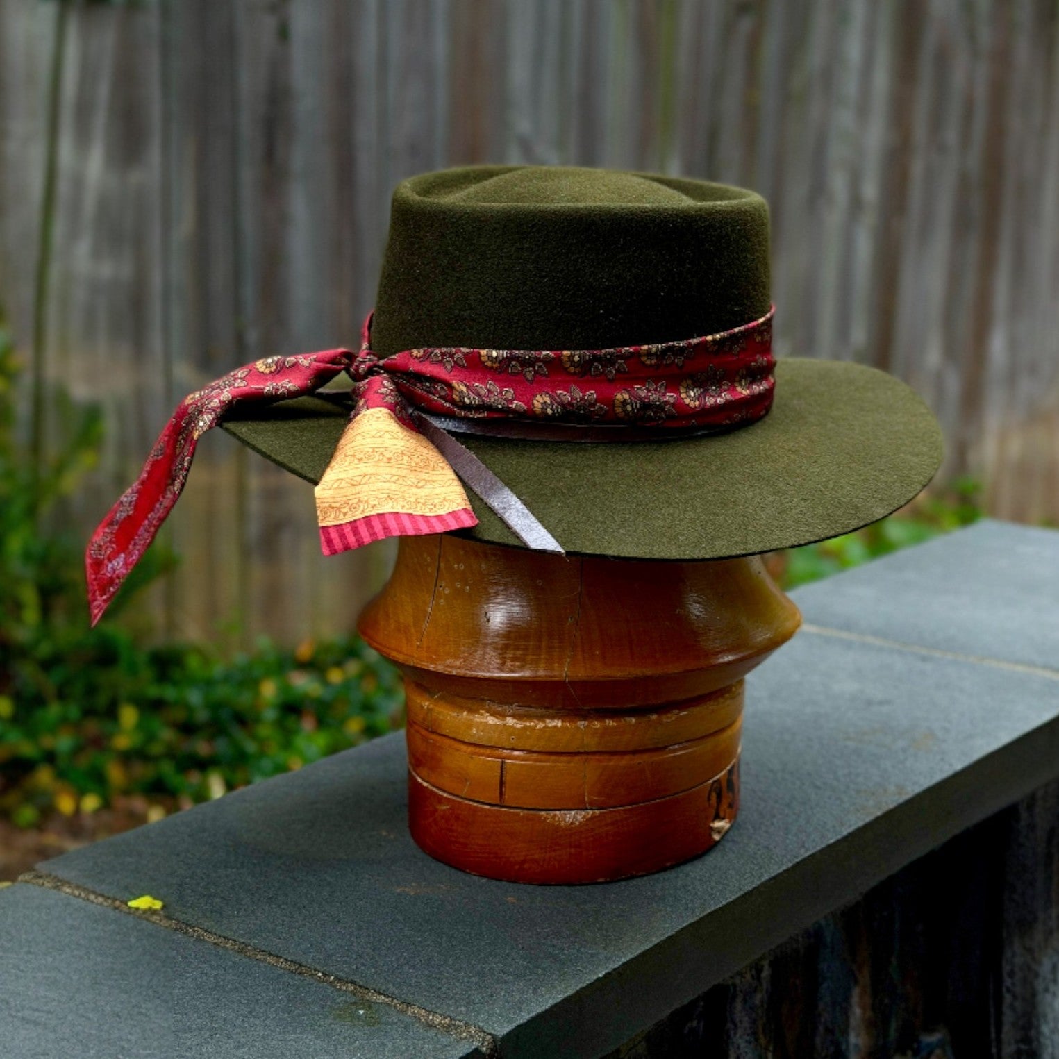 Reverie evokes a quiet moment of reflection and timeless style. This dark green telescope crown fedora is accented with a rich red paisley scarf and deep brown leather trim, creating a striking yet sophisticated contrast. Handmade in Asheville by Sigil Hats, it blends classic artistry with expressive detail — a hat for those who move through the world with thoughtfulness and subtle flair.