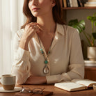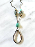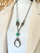 Gorgeous, faceted chandelier crystal pendant finished with Tibetan silver inlaid bead, turquoise, dragonskin jasper, and Austrian crystal.